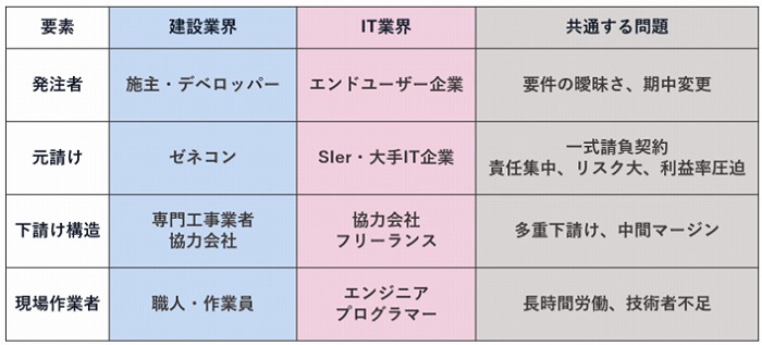 この表から分かりますように、IT業界と建設業界は社会構造だけでなく、それぞれが抱える問