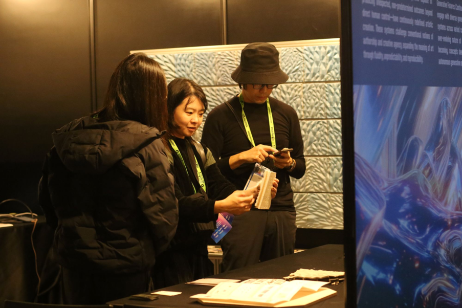 SIGGRAPH Asiaの展示で、多くの来場者に対して作品の背景や意図を直接説明し、対話でき